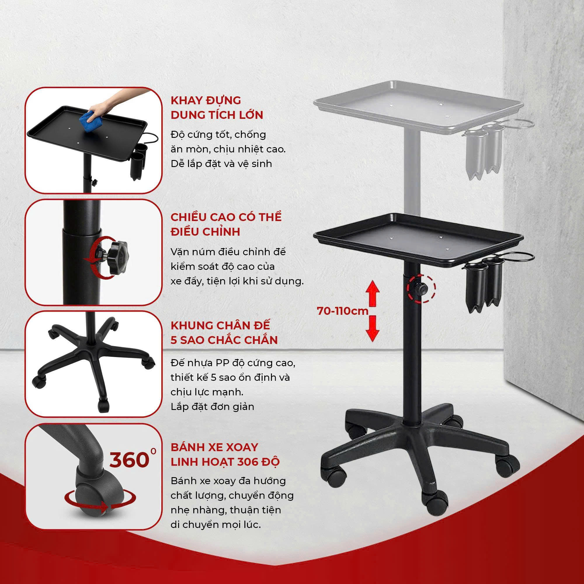 Khay để rộng rãi, chất liệu Alumitray + ống sắt + chân nhựa vững chắc, bền đẹp.